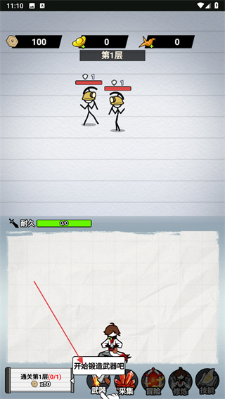 1、进入游戏,查看屏幕上方的资源数值如金币100和当前层数第1层,点击下方开始锻造武器吧。