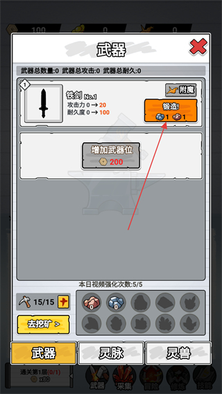 2、在武器界面,选择锻造武器,比如铁剑,消耗对应资源点击锻造,提升武器攻击力和耐久度。