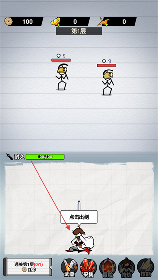4、面对敌人,待武器耐久度蓄满,点击点击出剑按钮,操控角色攻击敌人,直至通关当前层数。