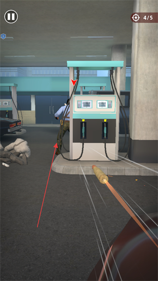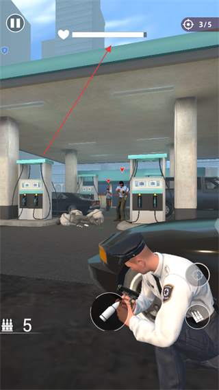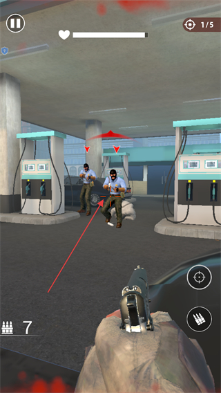 1、进入游戏,留意屏幕上方显示的剩余敌人数量如1/5,使用屏幕操作按钮控制视角和射击,对准敌人开枪射击。