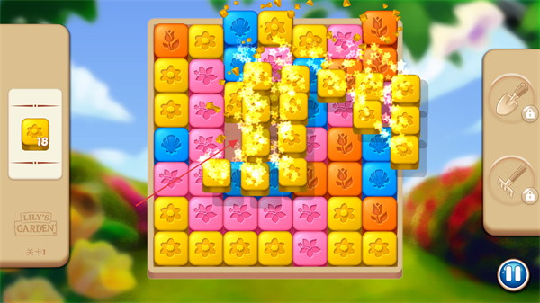 画面采用明亮柔和的色调,花园场景有动态效果如花瓣飘落、水流涌动,消除时特效清新不刺眼,带来舒适视觉感受。
