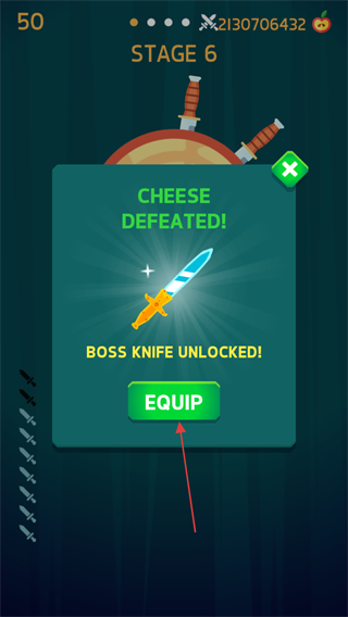 3、击败BOSS:CHEESE后,出现提示,点击EQUIP按钮解锁并装备新飞刀。