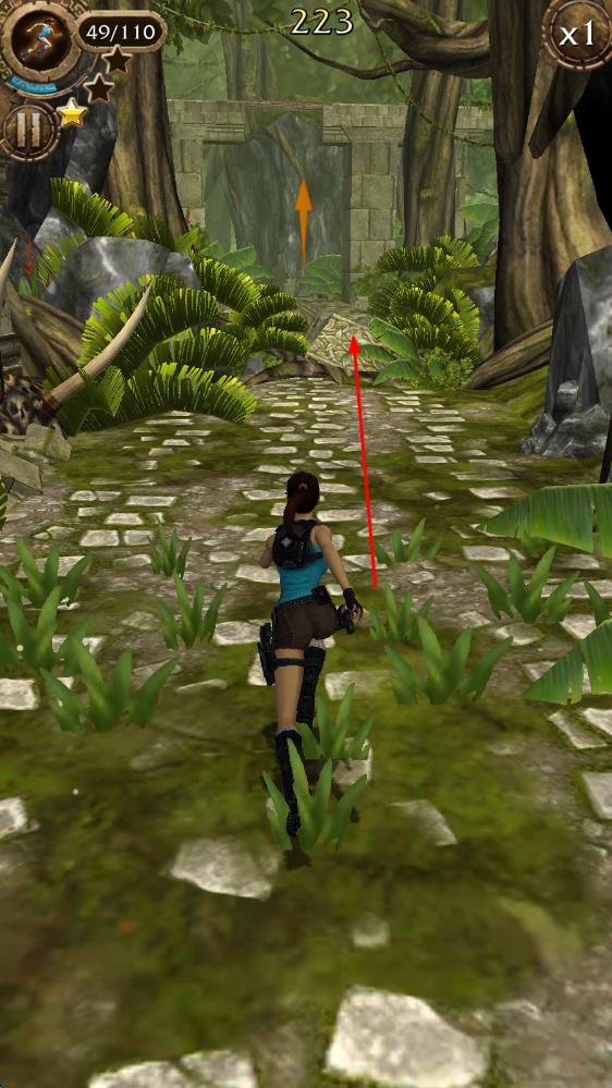 1、进入游戏后,先熟悉基础操作,通过滑动屏幕控制劳拉完成跳跃、下滑、转向等动作,在初始遗迹场景中躲避简单障碍,开启首次冒险。