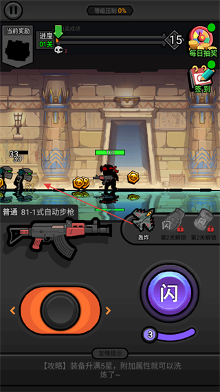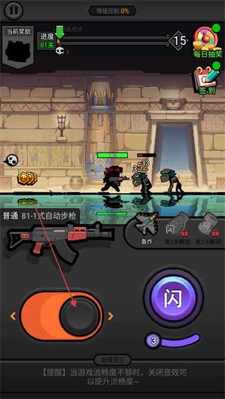 1、点击左侧橙色按钮操控角色,用普通81-1式自动步枪攻击敌人,积攒闪技能能量。