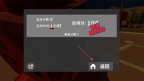 4、结束游戏后,查看击杀分数,生存时间和总得分,点击返回按钮回到主界面。