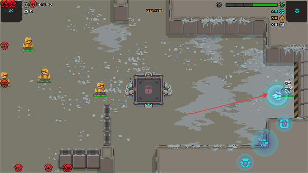 3、持续攻击红色敌人,注意躲避其攻击,消灭敌人后收集掉落物品,强化机甲。
