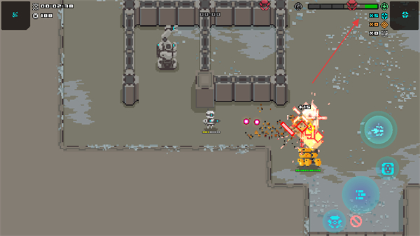 2D像素画面还原复古街机质感,工业风战场与机甲设计相得益彰,搭配射击时的像素粒子特效,营造出硬核又怀旧的战斗氛围。