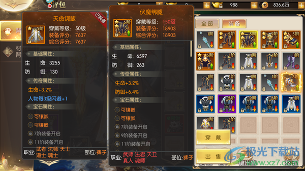 2、伏魔绑腿:裤子,适合真人,魂师,武师,法君,天卫职业,为玩家增加大量生命值以及防御力。