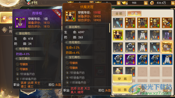 5、伏魔发冠:头盔,适合真人,魂师,武师,法君,天卫职业,为玩家增加大量生命值以及防御力。