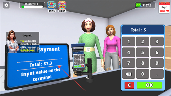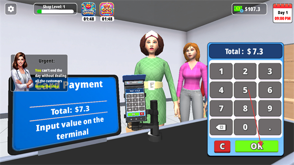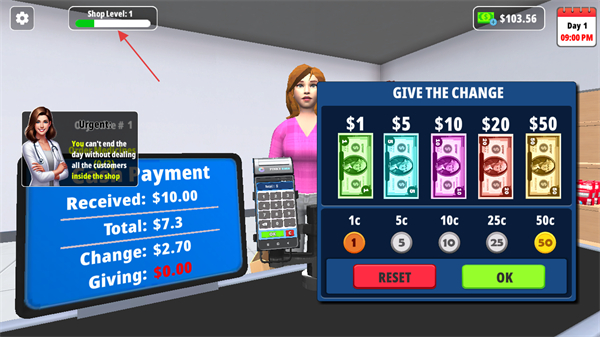 4、完成找零后,点击LEAVE让顾客离开,同时关注左上角ShopLevel等级,通过完成交易提升店铺等级和收益。