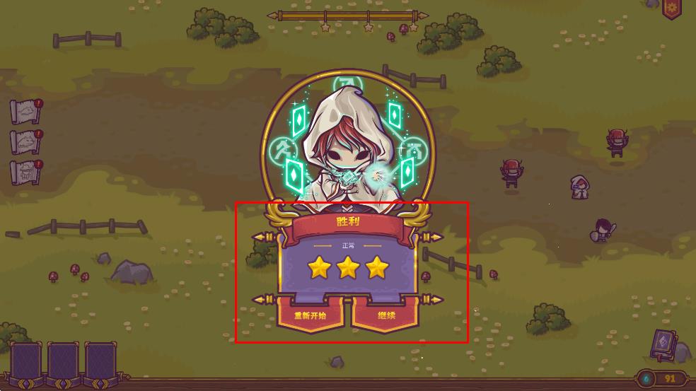 4、成功击败所有敌方怪物后,游戏界面显示“胜利”及三星评价,可选择“继续”进行后续游戏。