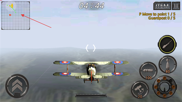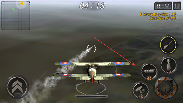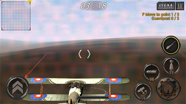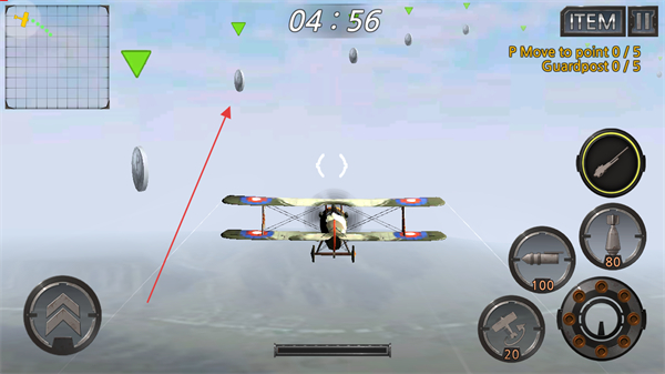 4、通过屏幕左下方虚拟摇杆控制飞机方向和飞行姿态,持续完成任务目标。