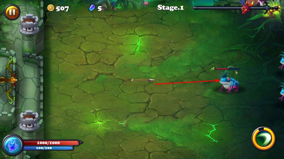 2、在第一关游戏界面,操控弓箭攻击敌方青蛙怪物,阻止其靠近城堡。