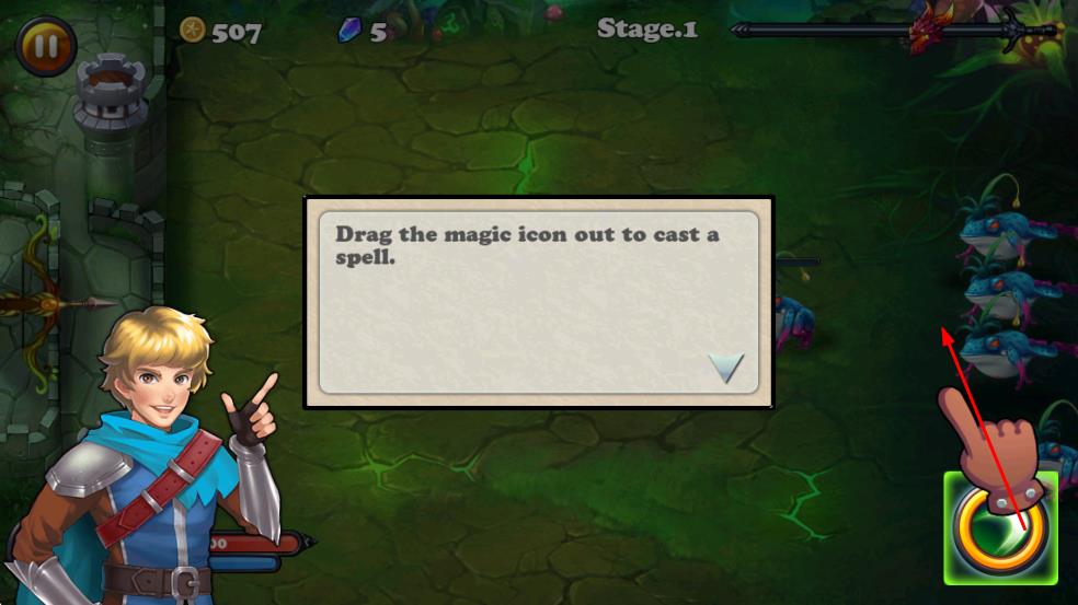 3、按照提示,拖动魔法图标释放法术,辅助攻击敌方怪物。