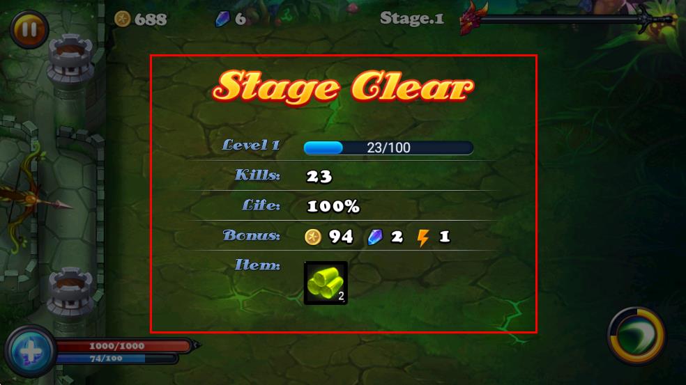 4、成功消灭所有敌方怪物后,游戏界面显示“Stage Clear”,完成第一关。