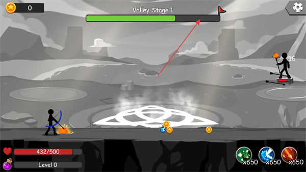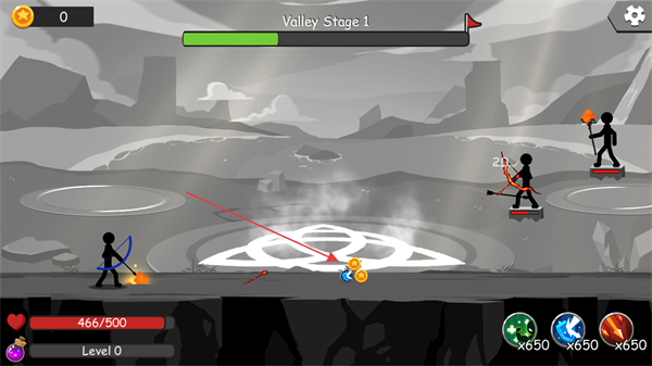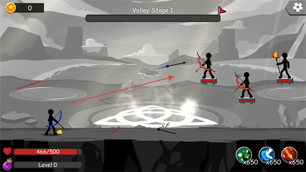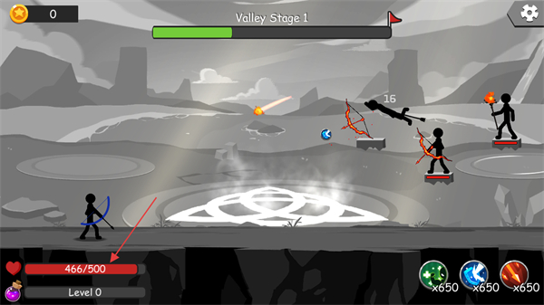 1、进入ValleyStage1关卡,留意左下角生命值条,拉动火柴人调整射箭角度和力度攻击敌人。