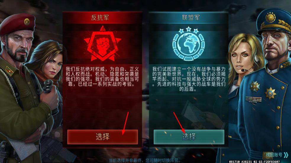 1、打开战争策略游戏,在“反抗军”和“联盟军”阵营中,选择其中一个阵营,点击对应“选择”按钮。