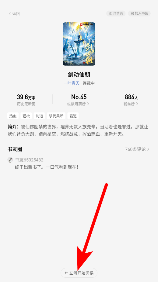 2、进入小说阅读界面后,左滑开始阅读,进入阅读相关操作页面。