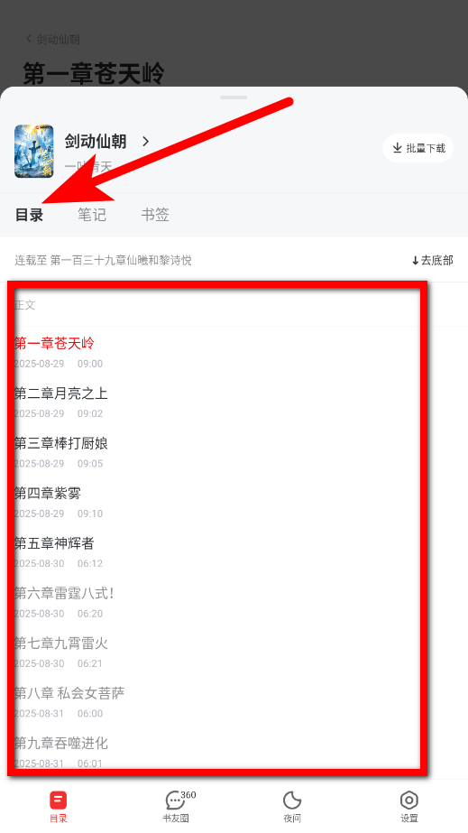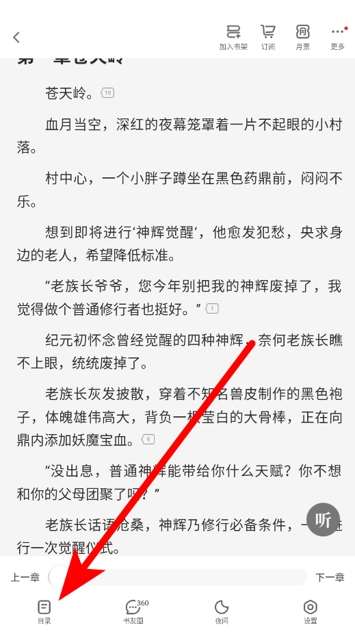 3、在阅读页面长按,出现目录,点击左下角目录选项。