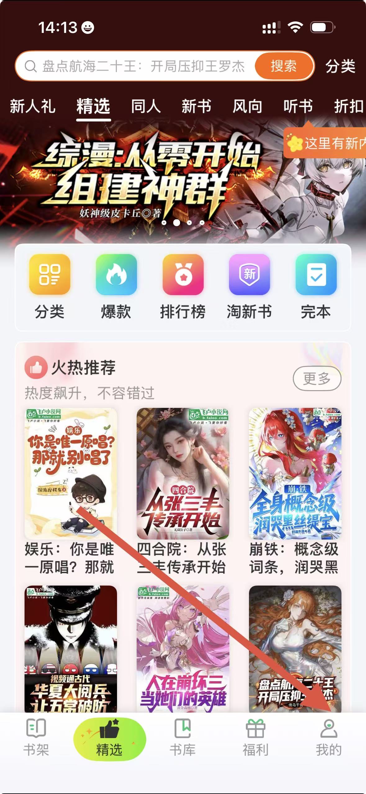 1、在飞卢小说首页,点击底部导航栏中最右侧我的选项,进入个人页面。