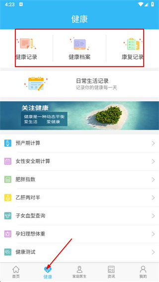 2、点击底部导航栏健康,能看到健康记录、健康档案、康复记录等选项,用户可随时记录自身健康状况,管理个人健康档案。
