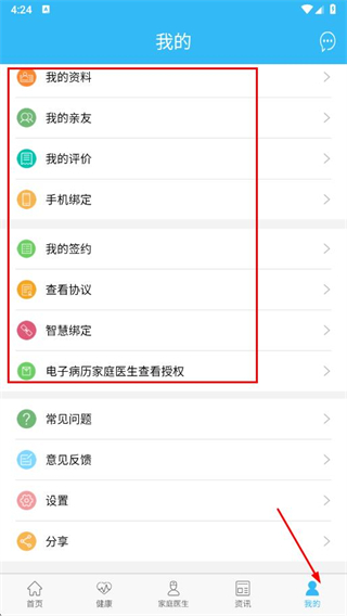 5、在我的页面,用户可以管理个人资料,绑定亲友信息,查看评价、进行手机绑定、管理签约信息、查看协议、进行智慧绑定等。