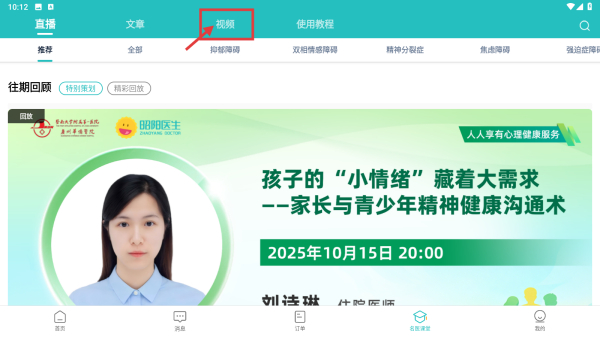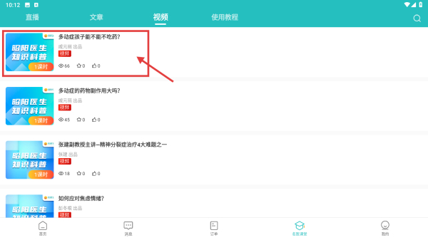 2、在名医课堂页面,选择视频分类,浏览医疗科普视频列表。