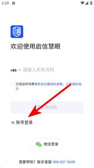 1、在启信宝的登录页面,点击账号登录,进入账号登录页面。