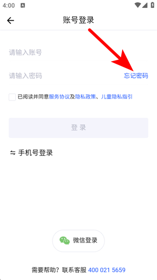 2、在账号登录页面,点击忘记密码按钮,进入重置密码页面。