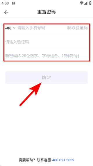 3、在页面输入手机号码、验证码及新密码后,点击确定完成重置操作。