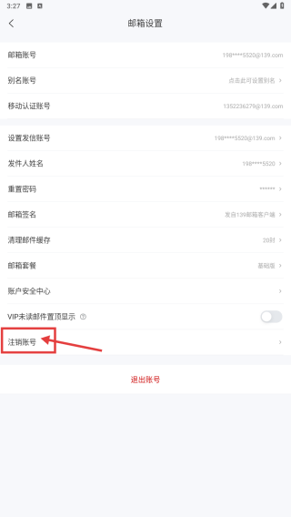 4、在邮箱设置页面,点击注销账号选项,按提示完成账号注销操作。
