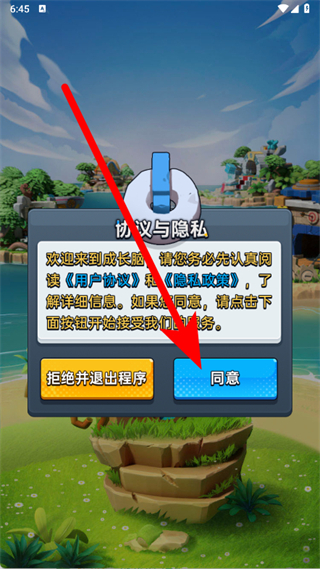 1、打开成长脑,在协议与隐私弹窗中点击同意。