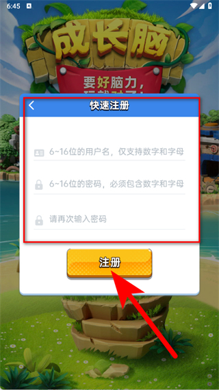 3、依次输入6-16位的用户名、6-16位且包含数字和字母的密码后,点击注册。