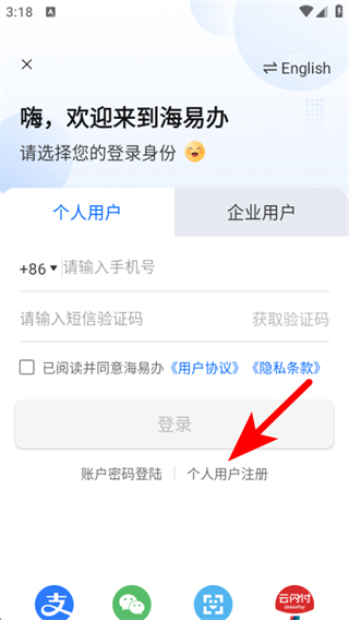 2、在登录界面,点击个人用户注册,进入注册方式选择的页面。