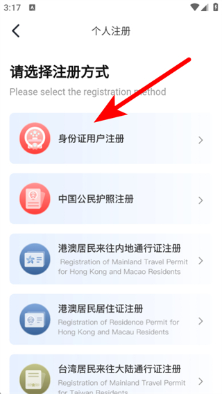 3、在注册方式选择页面,选择注册的方式如身份证用户注册。