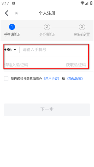 4、进入手机验证环节,输入手机号、获取并填写验证码,完成后续注册操作。