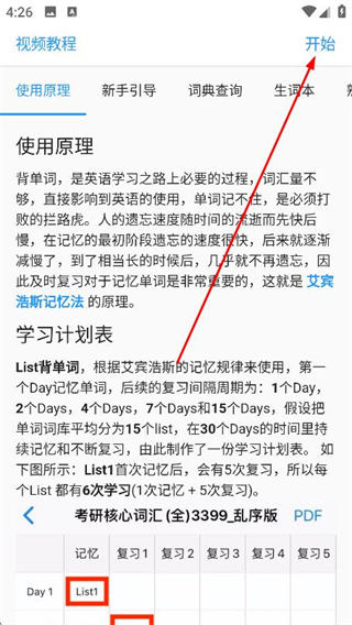 1、打开List背单词app,在初始页面点击右上角的开始按钮。