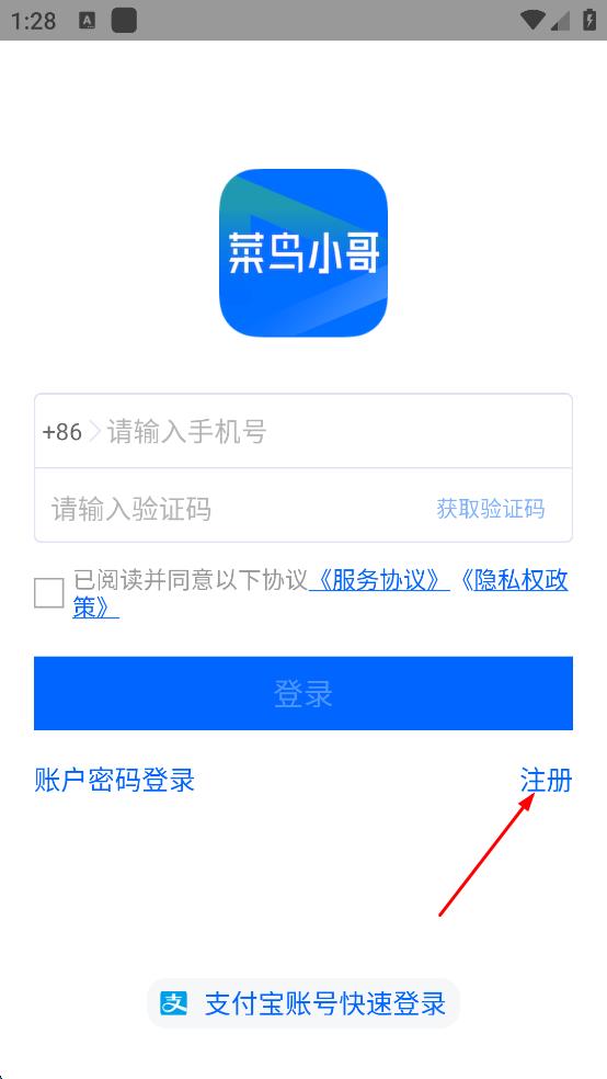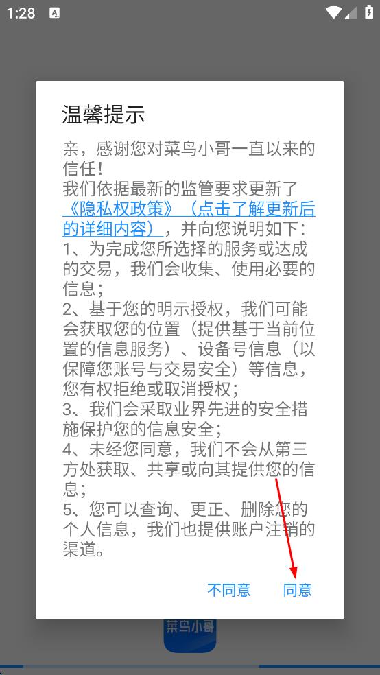 1、打开菜鸟小哥应用,弹出“温馨提示”框,认真阅读后点击“同意”,进入到登录页面。