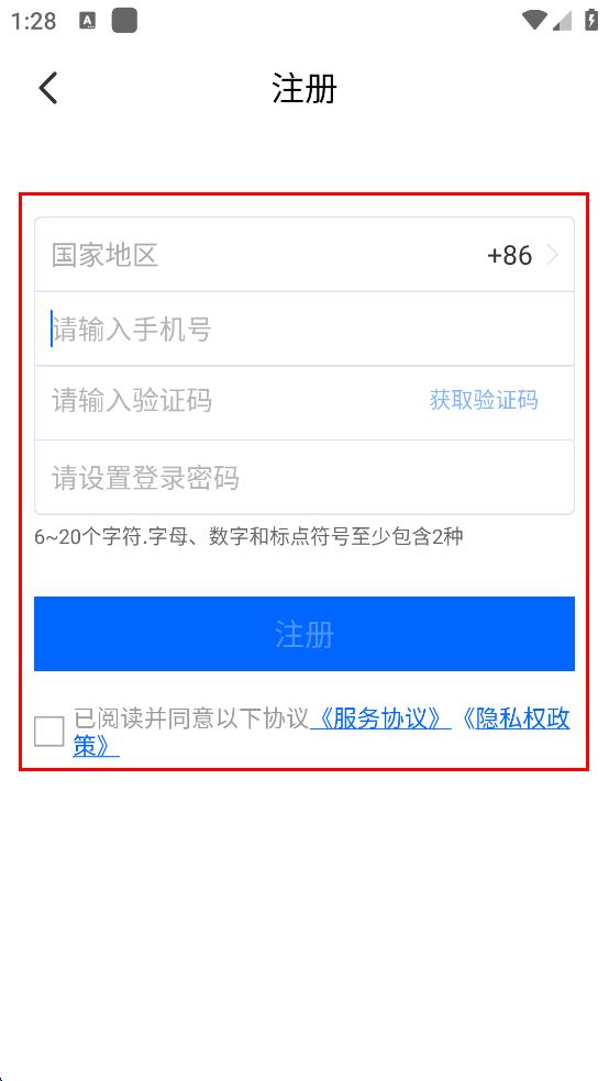 3、在注册页面,输入手机号,点击“获取验证码”,输入收到的验证码,然后设置符合要求的登录密码,勾选已阅读并同意以下协议服务协议和隐私权政策,点击注册。
