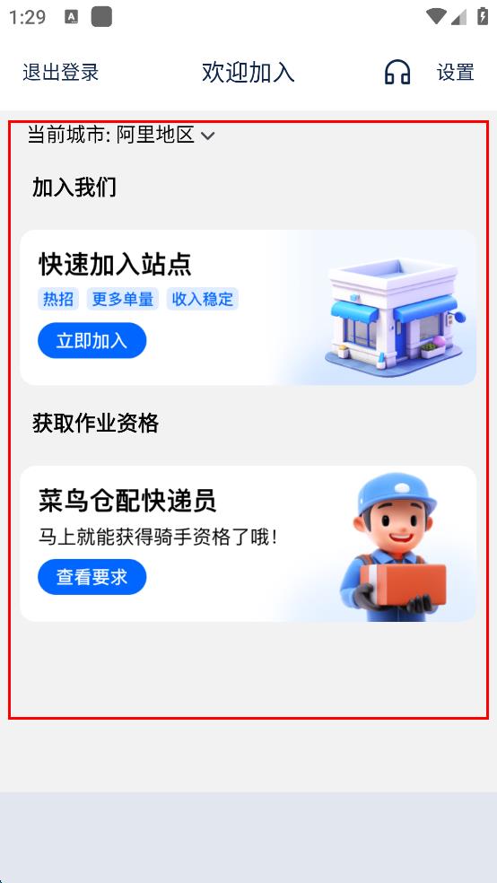 4、注册完成后进入到应用内页面,可查看当前城市,以及“快速加入站点”“获取作业资格”等相关板块,根据需求进行后续操作。