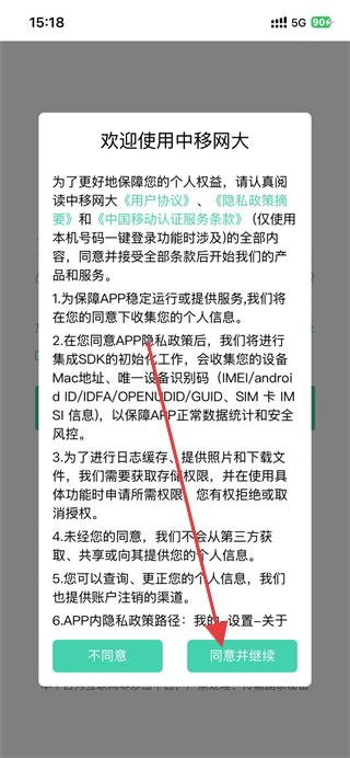 1、打开中移网大软件,在弹出的页面,点击同意并继续。