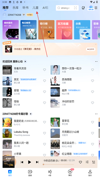 1、打开酷狗APP,在首页上点击儿童的标签。