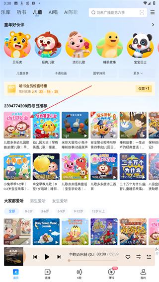 2、进入儿童的页面内,选择并点击要听的歌单。