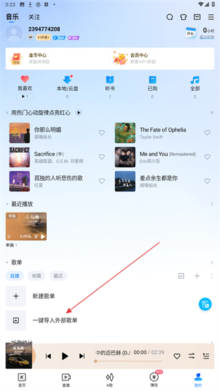 2、进入我的页面内,在歌单下点击一键导入外部歌单的按钮。