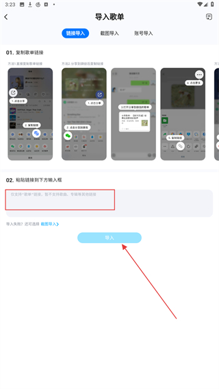 3、在导入歌单的页面内,在输入框内输入链接后点击导入即可。