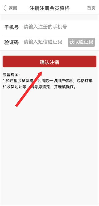 3、在注销的页面,输入手机号、验证码后点击确认注销。