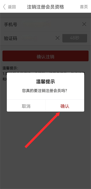 4、在温馨的提示框中,点击确认按钮,完成账号注销操作。