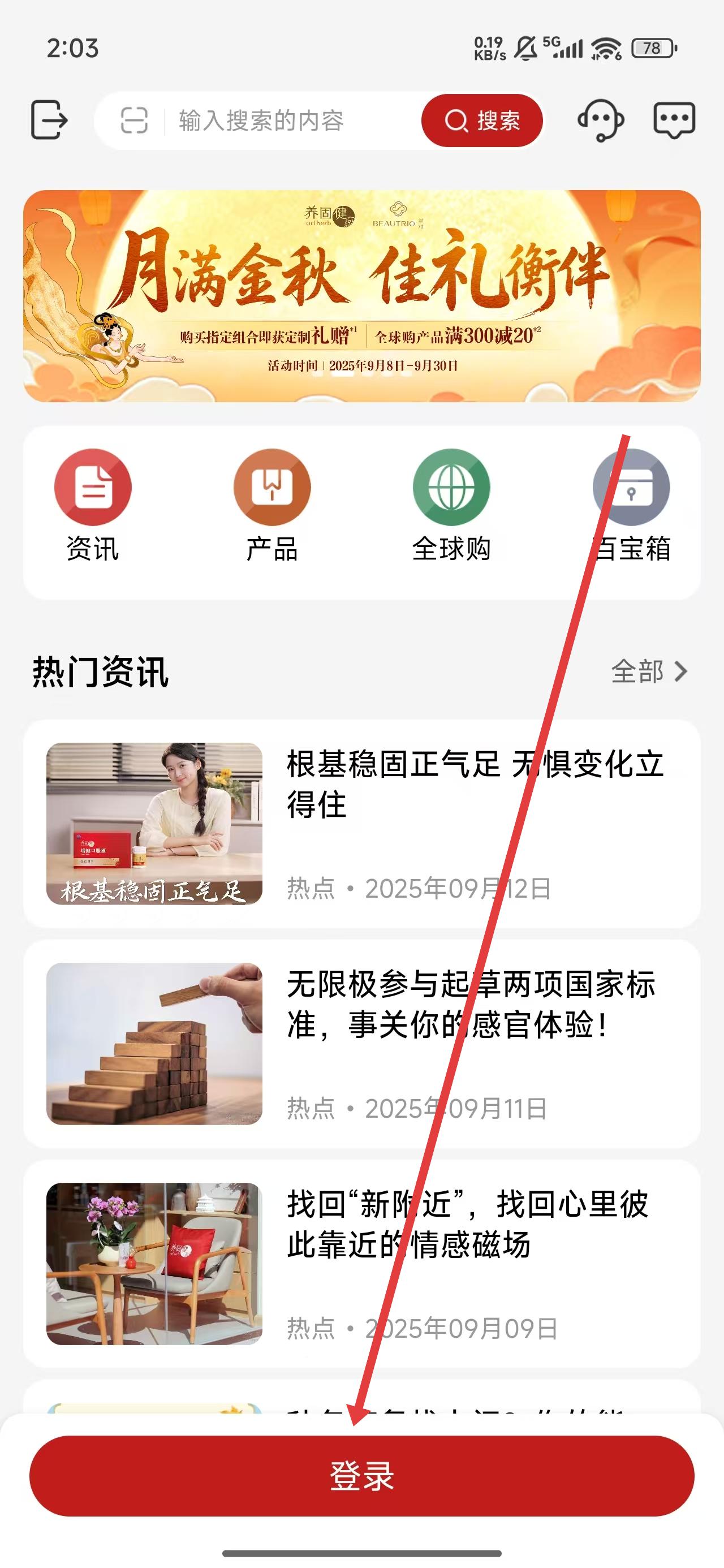 1、进入到无限极首页中,点击底部登录按钮,准备开始登录操作。