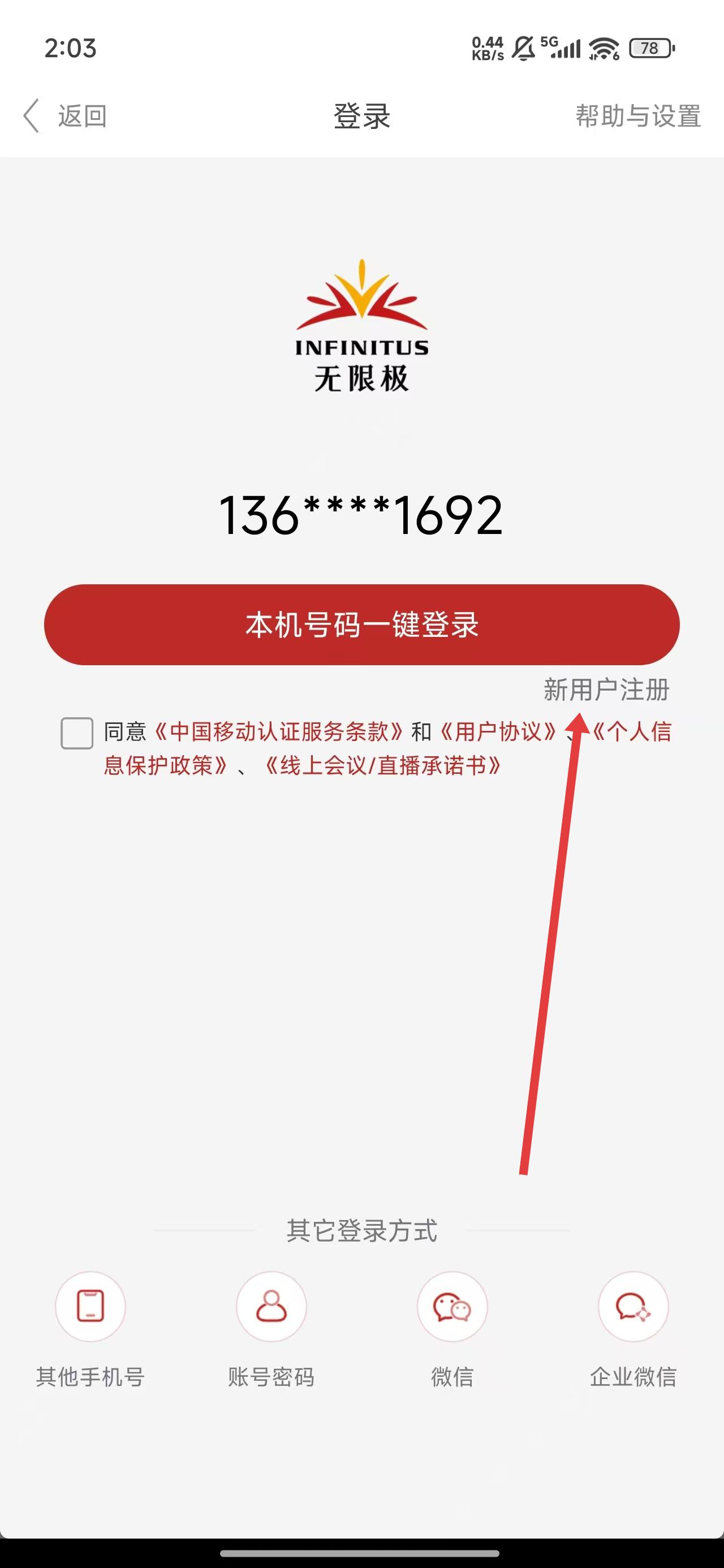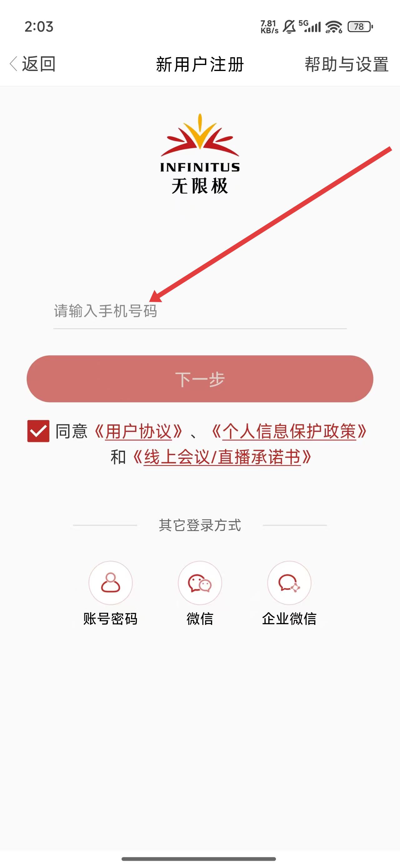 4、进入到新用户注册页面中,点击输入框填写手机号码以便获取验证码后,完成注册操作。