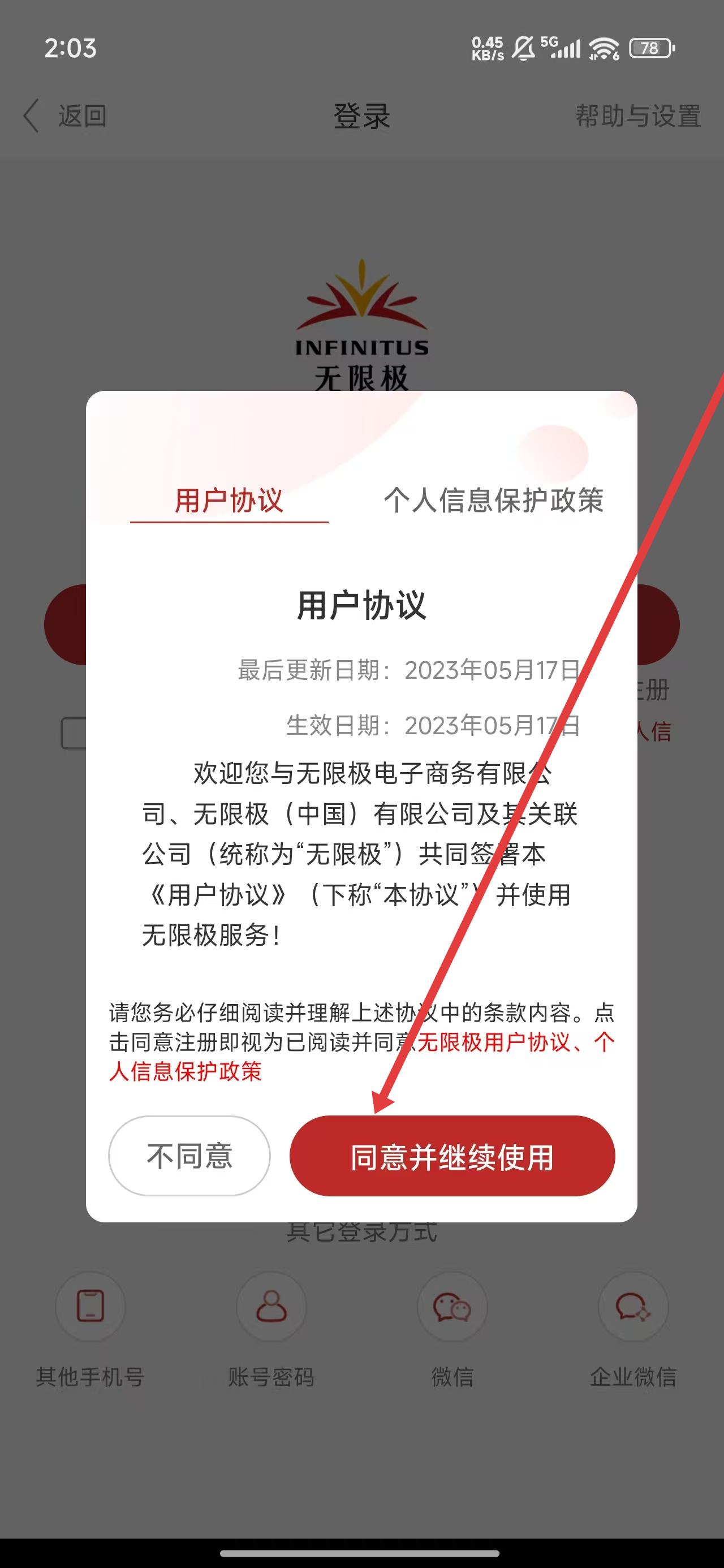 3、可以通过点击弹窗中的同意并继续使用按钮,开始注册操作。